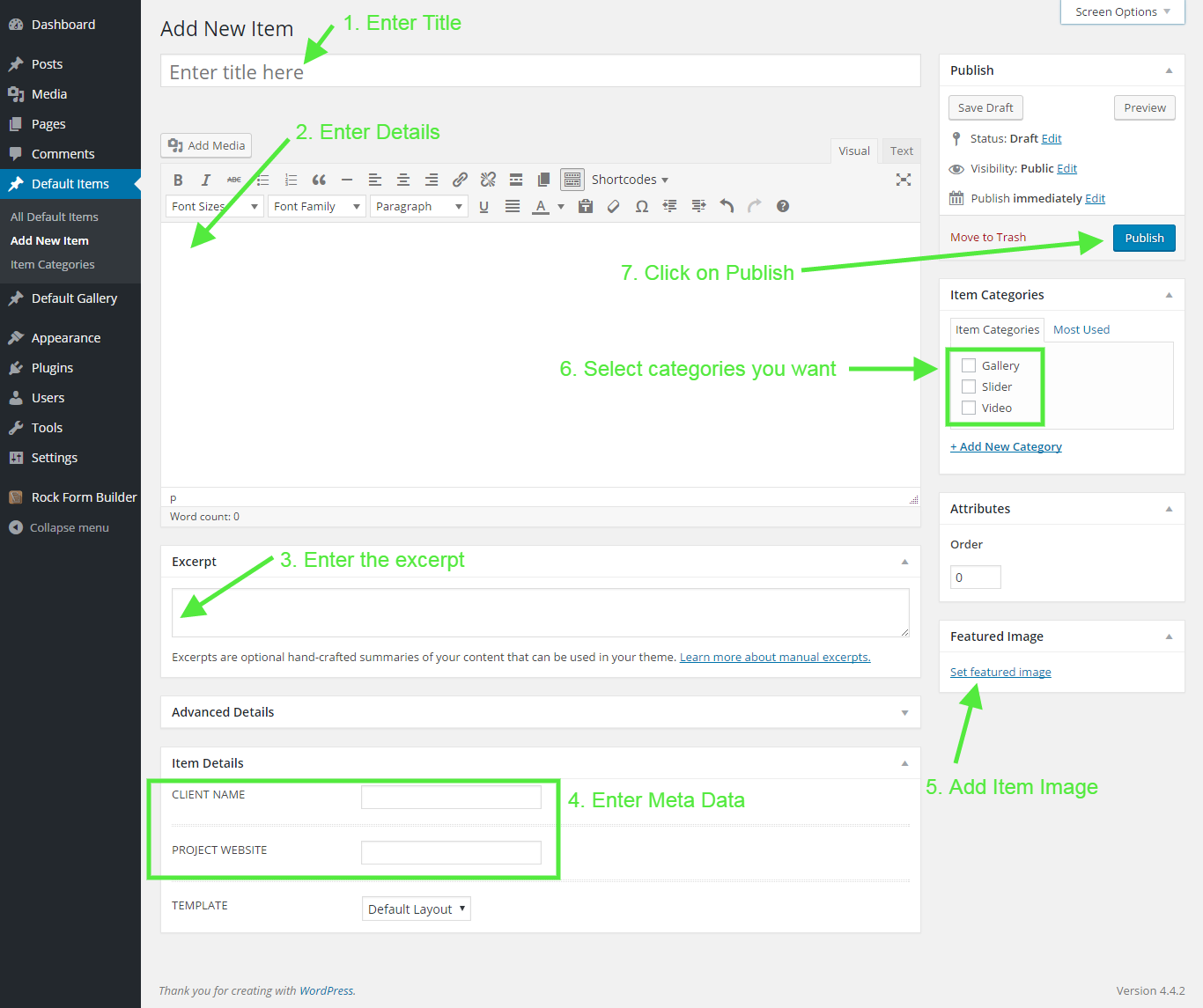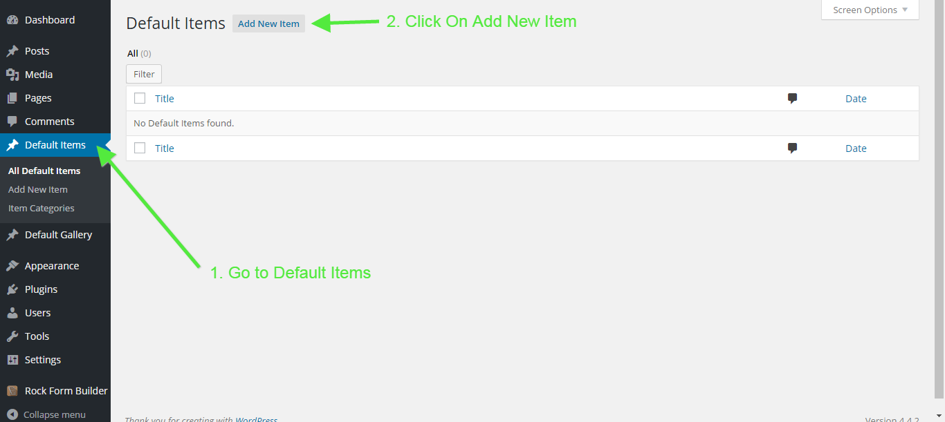 - Login to your Wordpress and go to "Default Items > Add New".