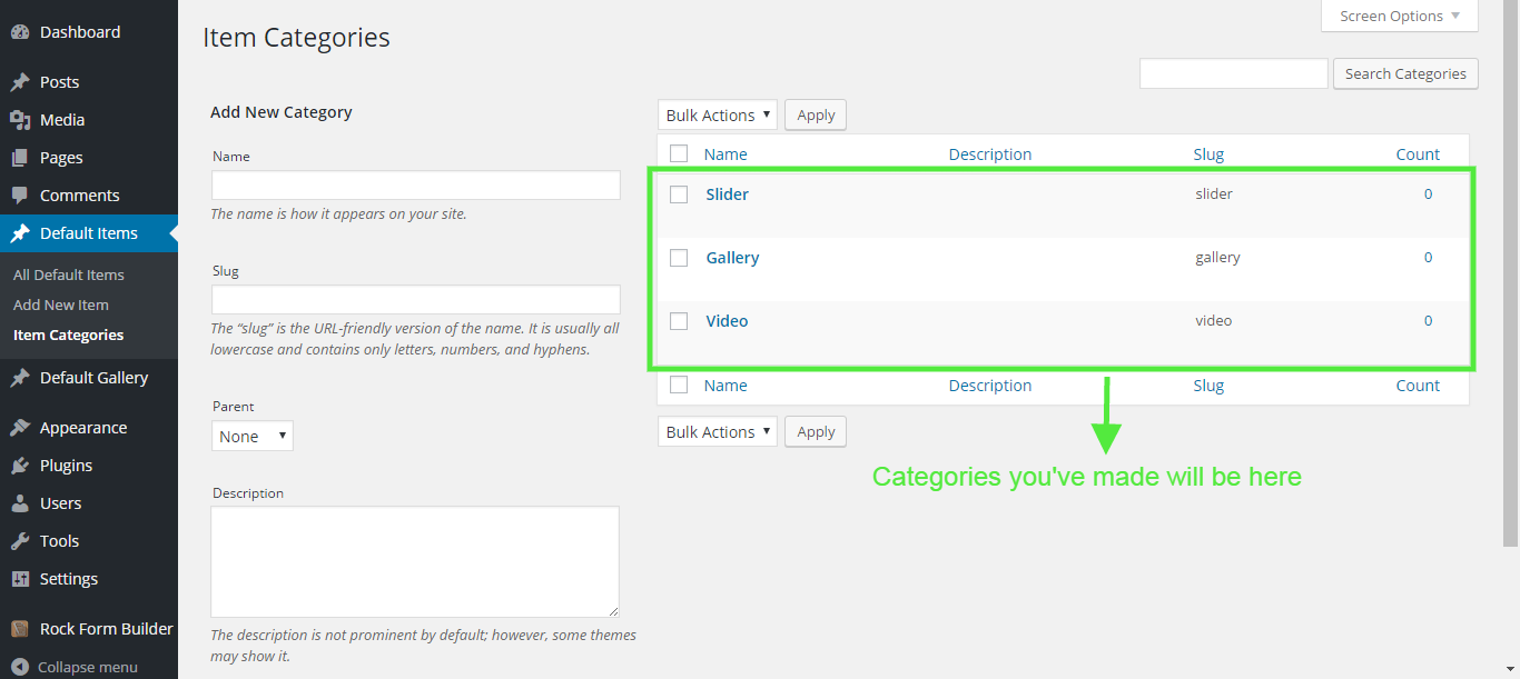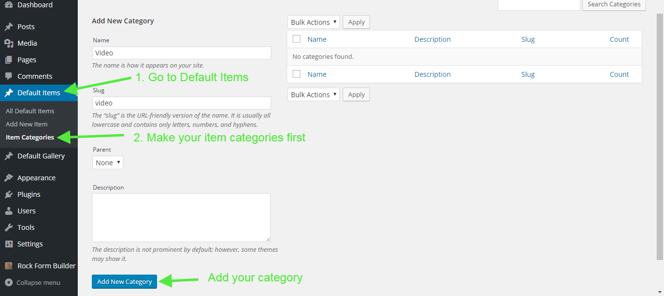 - Login to your Wordpress and go to "Default Items > Item Categories".